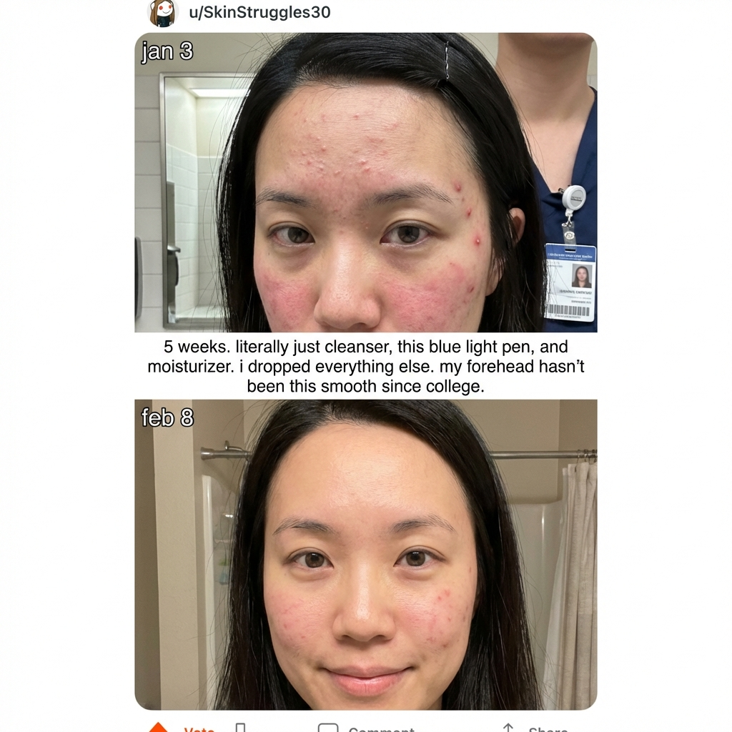 Yes. 415nm blue light has been studied extensively and is used in professional dermatology offices globally. It works by destroying P. acnes bacteria inside the pore, which is the root cause of most inflammatory breakouts. This isn't a trend or a gimmick. It's the same science your dermatologist uses, just in a device you can hold in your hand.